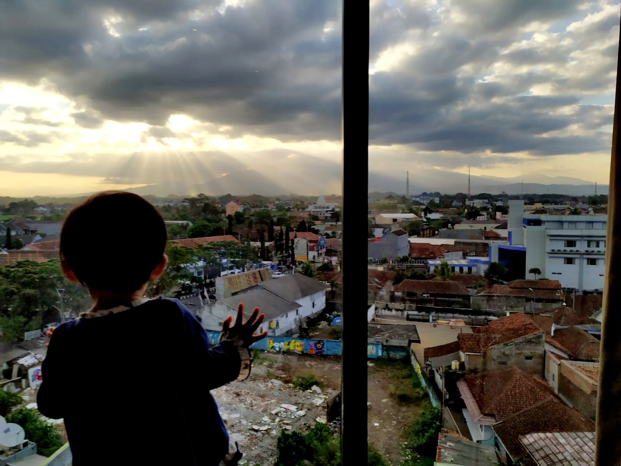 Lagi-lagi Rai menikmati kamar ini. Dia senang guling-guling dan mengeksplor ke setiap sudut. Nah pas sore hari, dari dalam kamar kita bisa lihat matahari terbenam.
